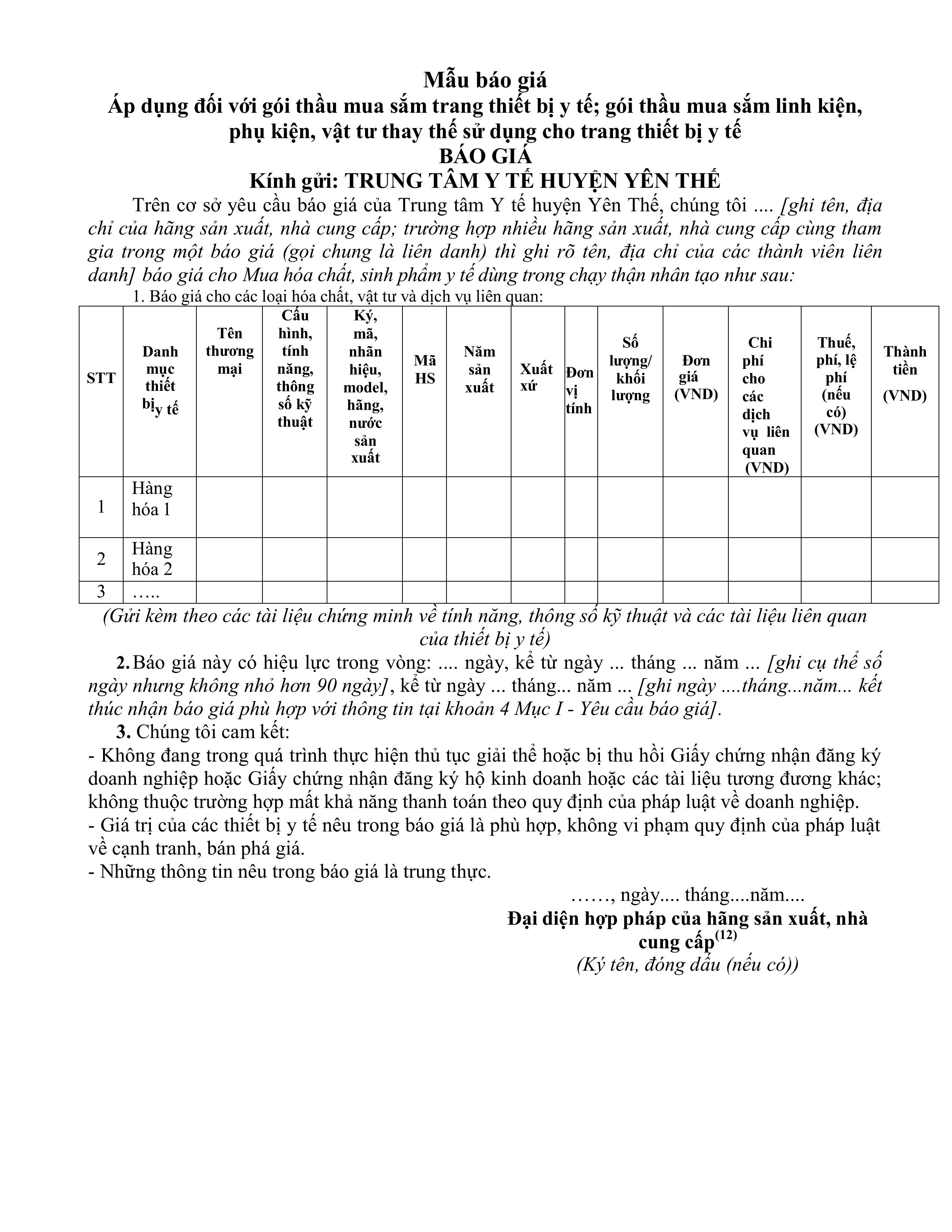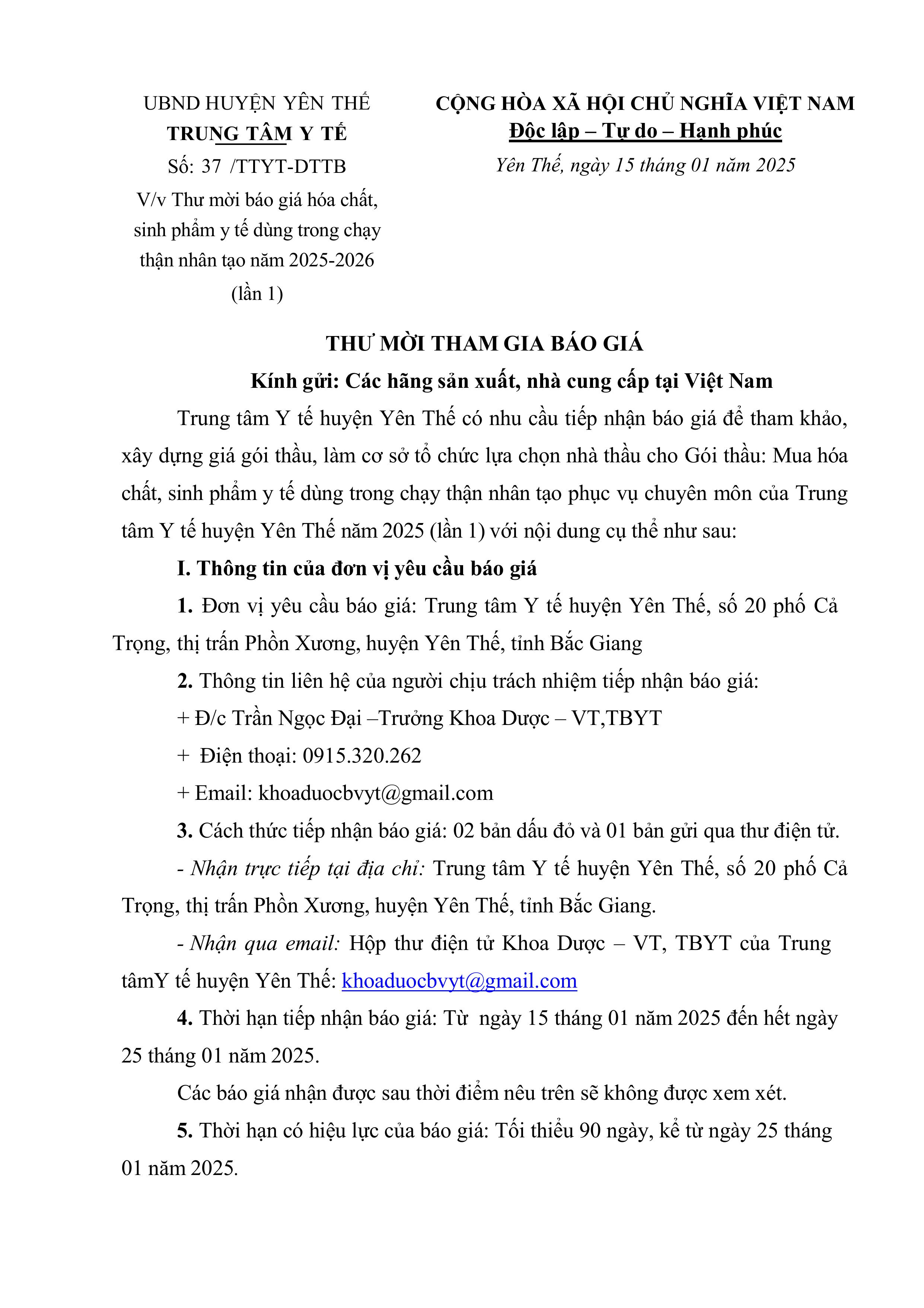 Thư mời báo giá hóa chất, sinh phẩm y tế dùng trong chạy thận nhân tạo 2025-2026