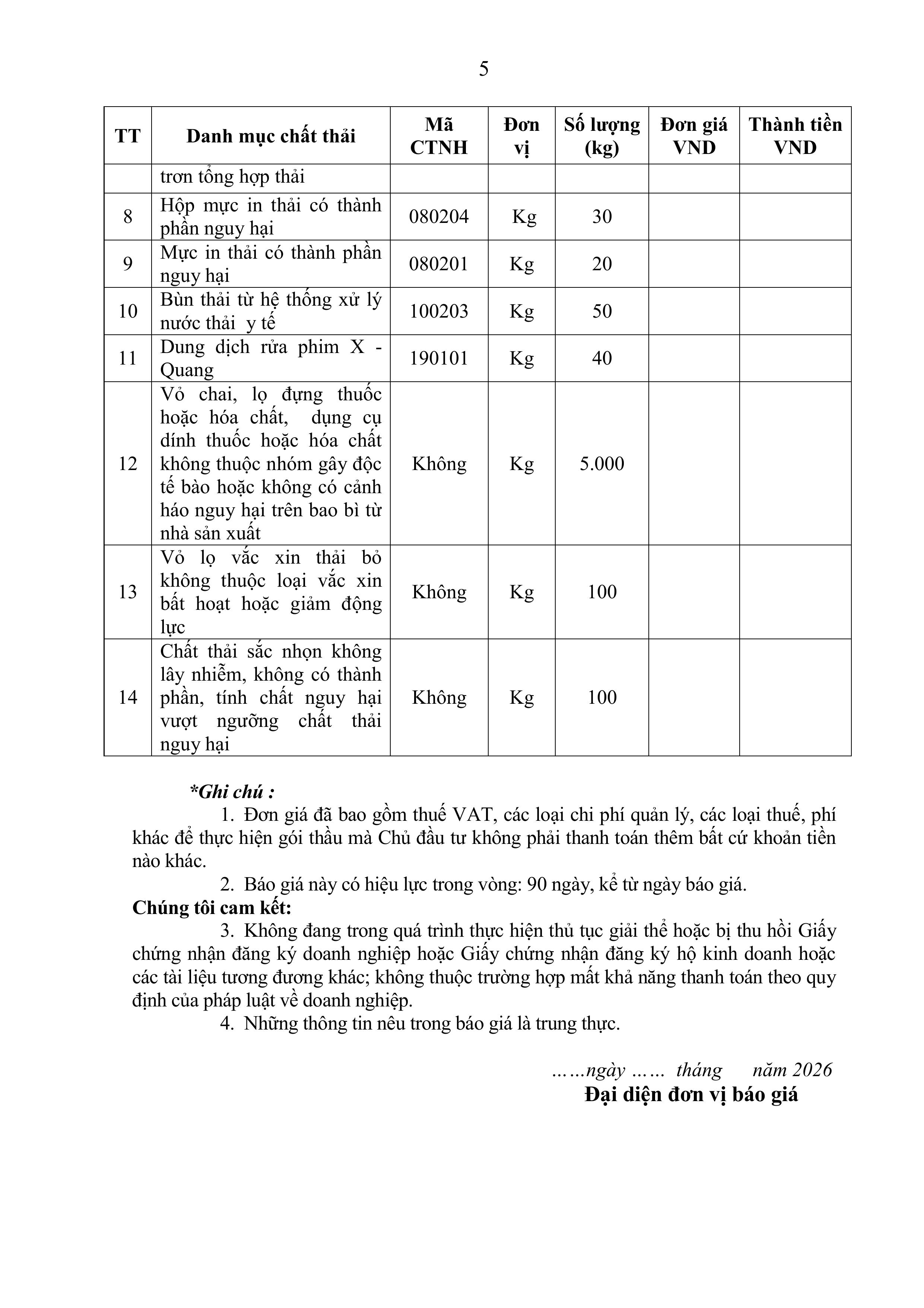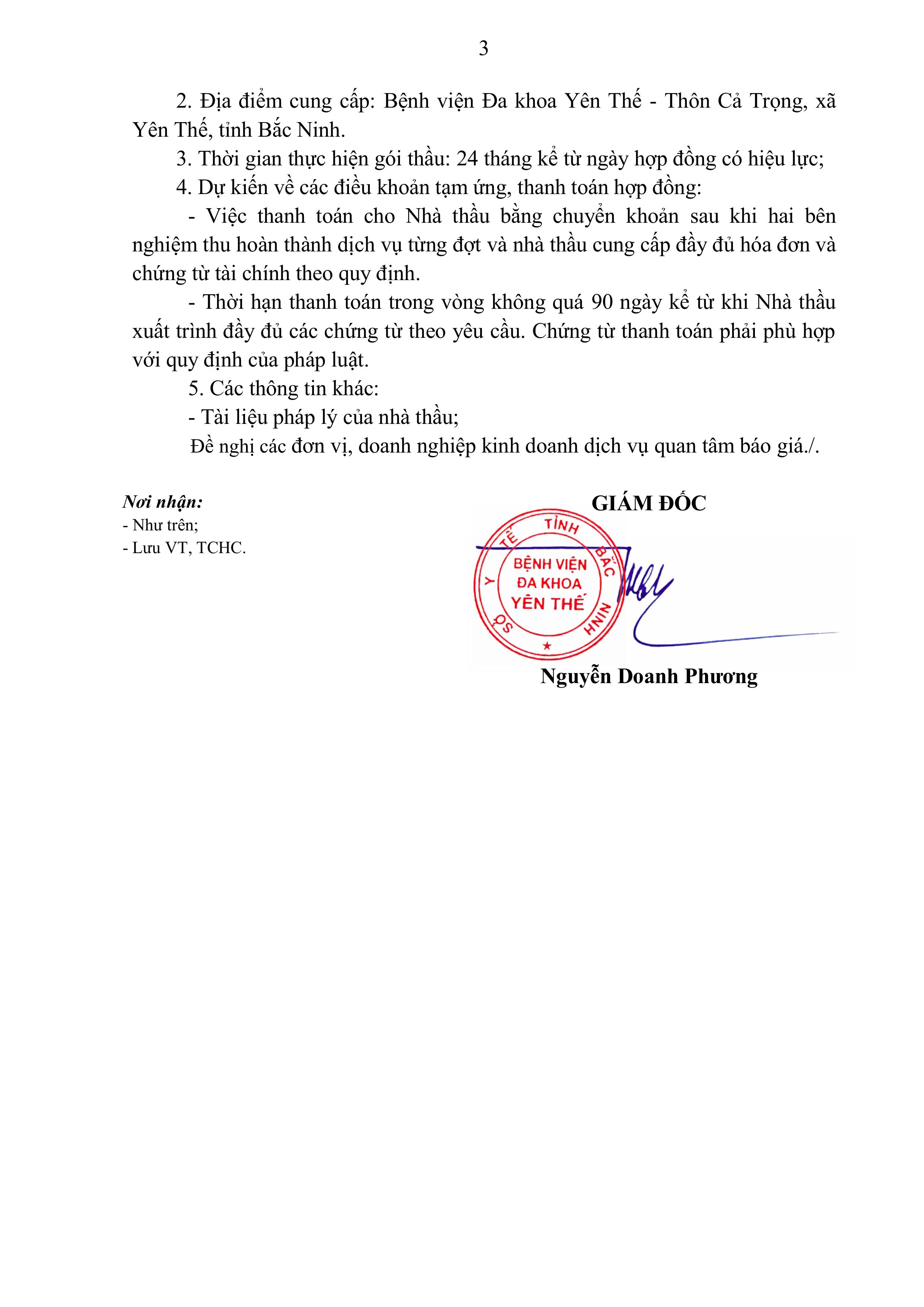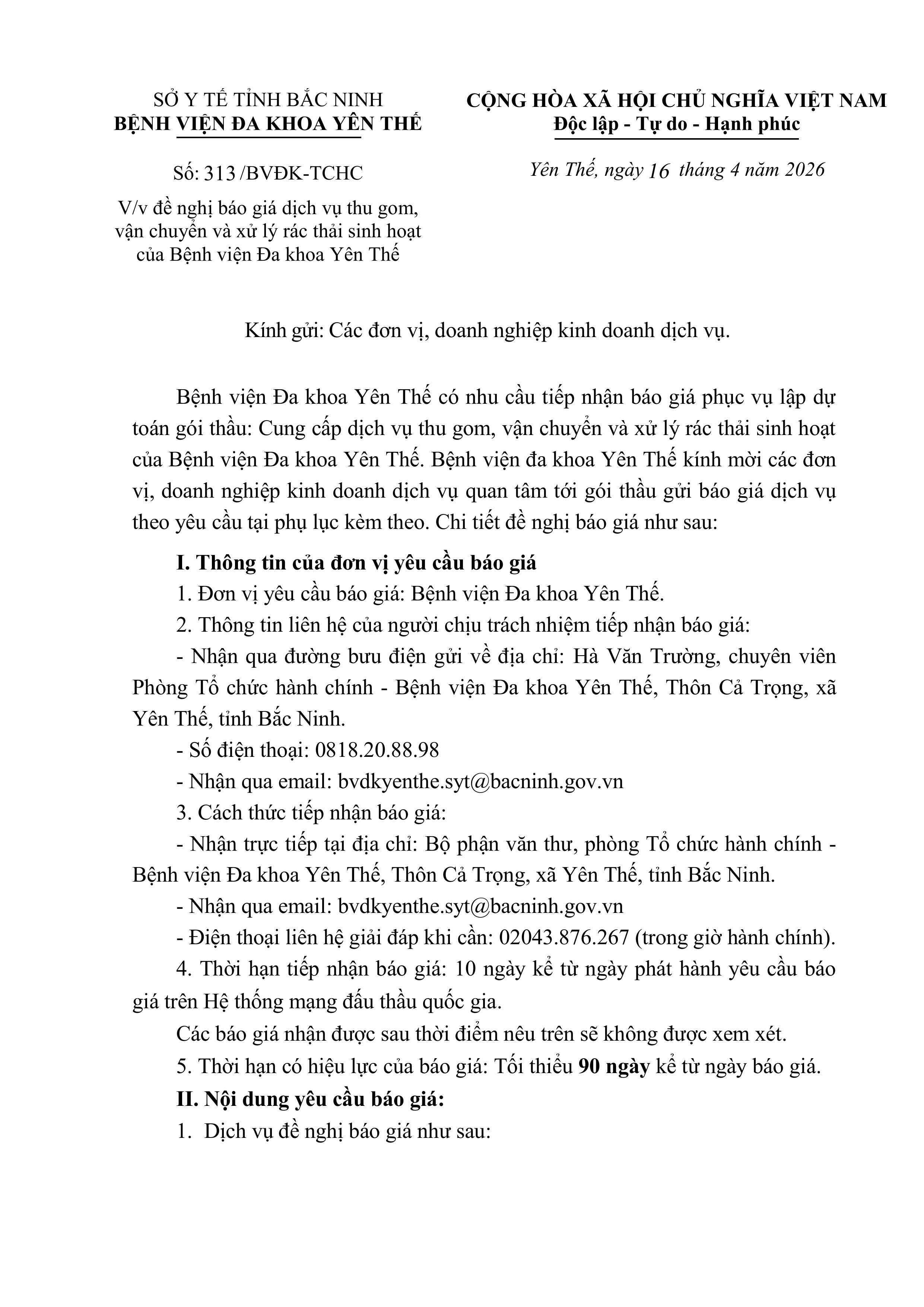 Thư mời báo giá dịch vụ thu gom, vận chuyển và xử lý rác thải sinh hoạt của Bệnh viện Đa khoa Yên Thế (Thời hạn tiếp nhận báo giá: Từ ngày 16/04/2026 đến ngày 26/04/2026)