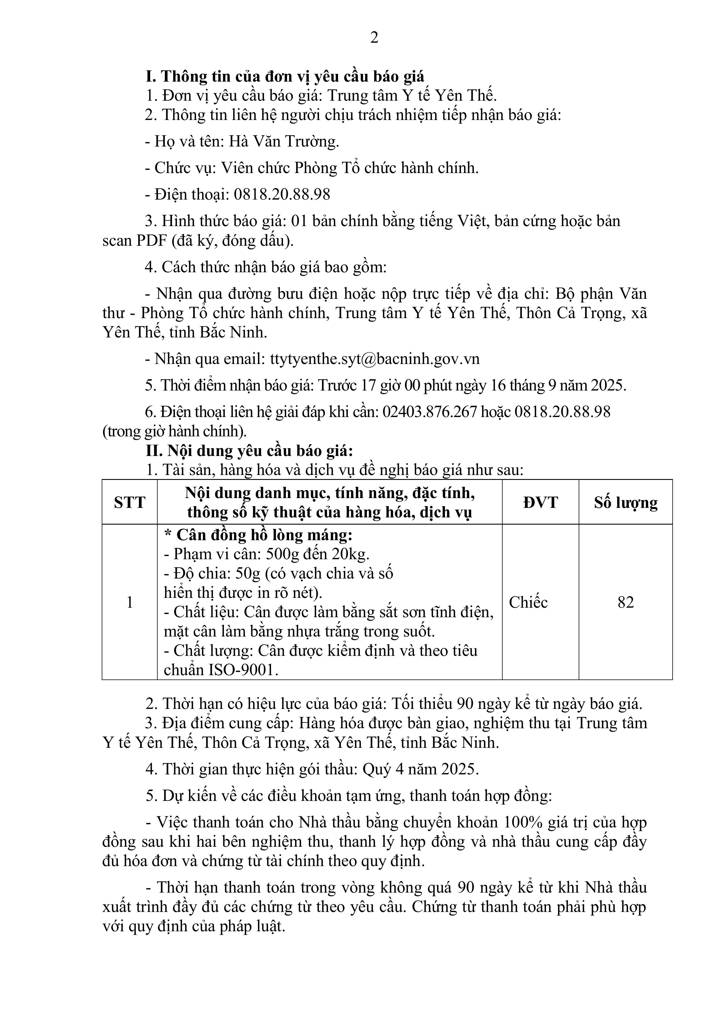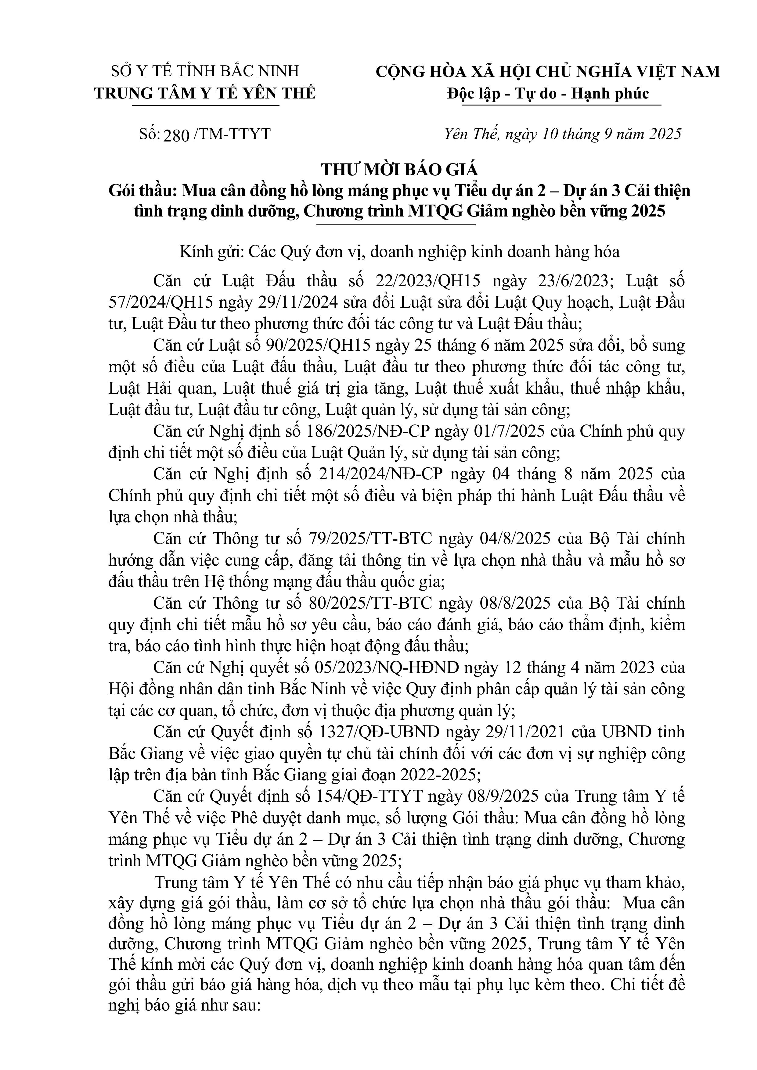 Thư mời báo giá gói thầu: Mua cân đồng hồ lòng máng phục vụ Tiểu dự án 2