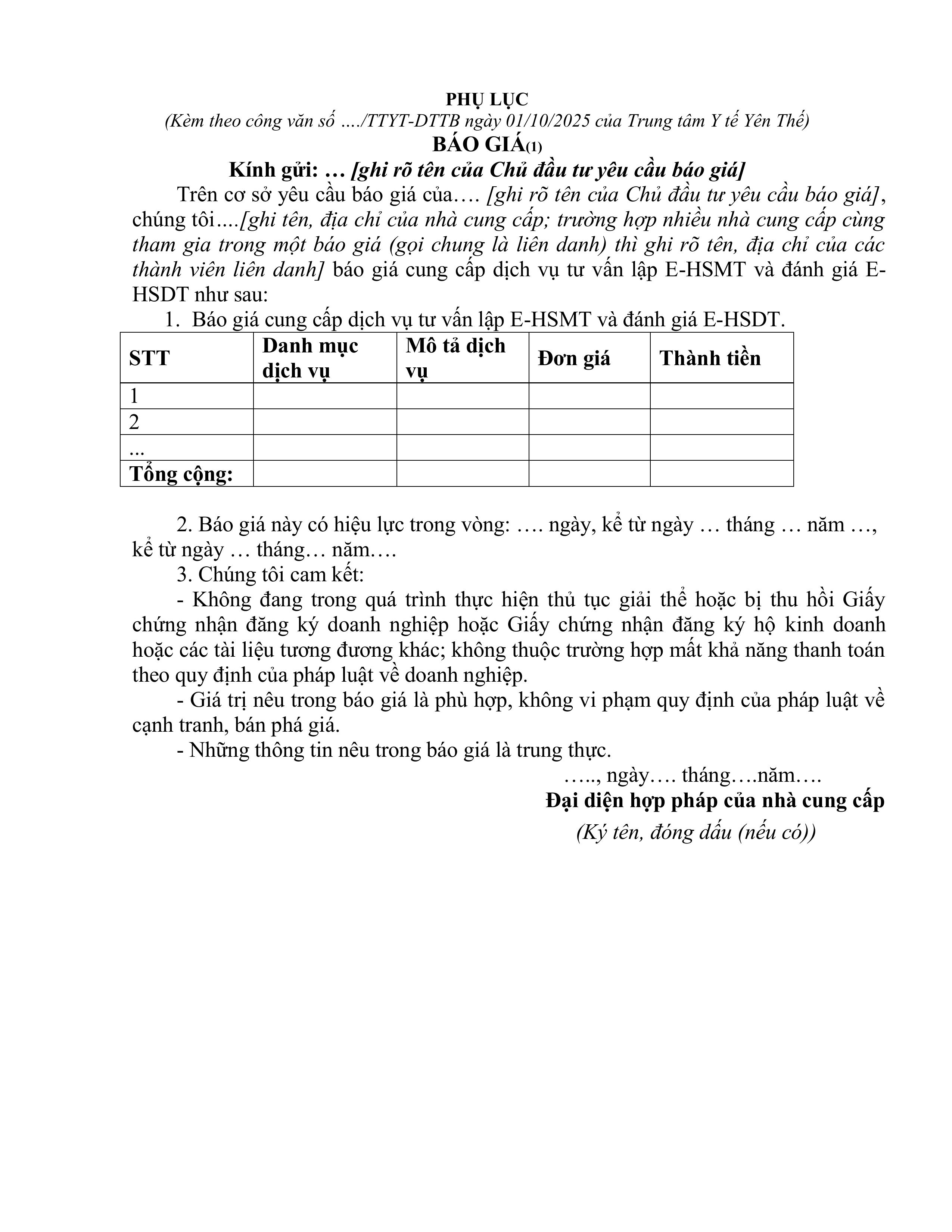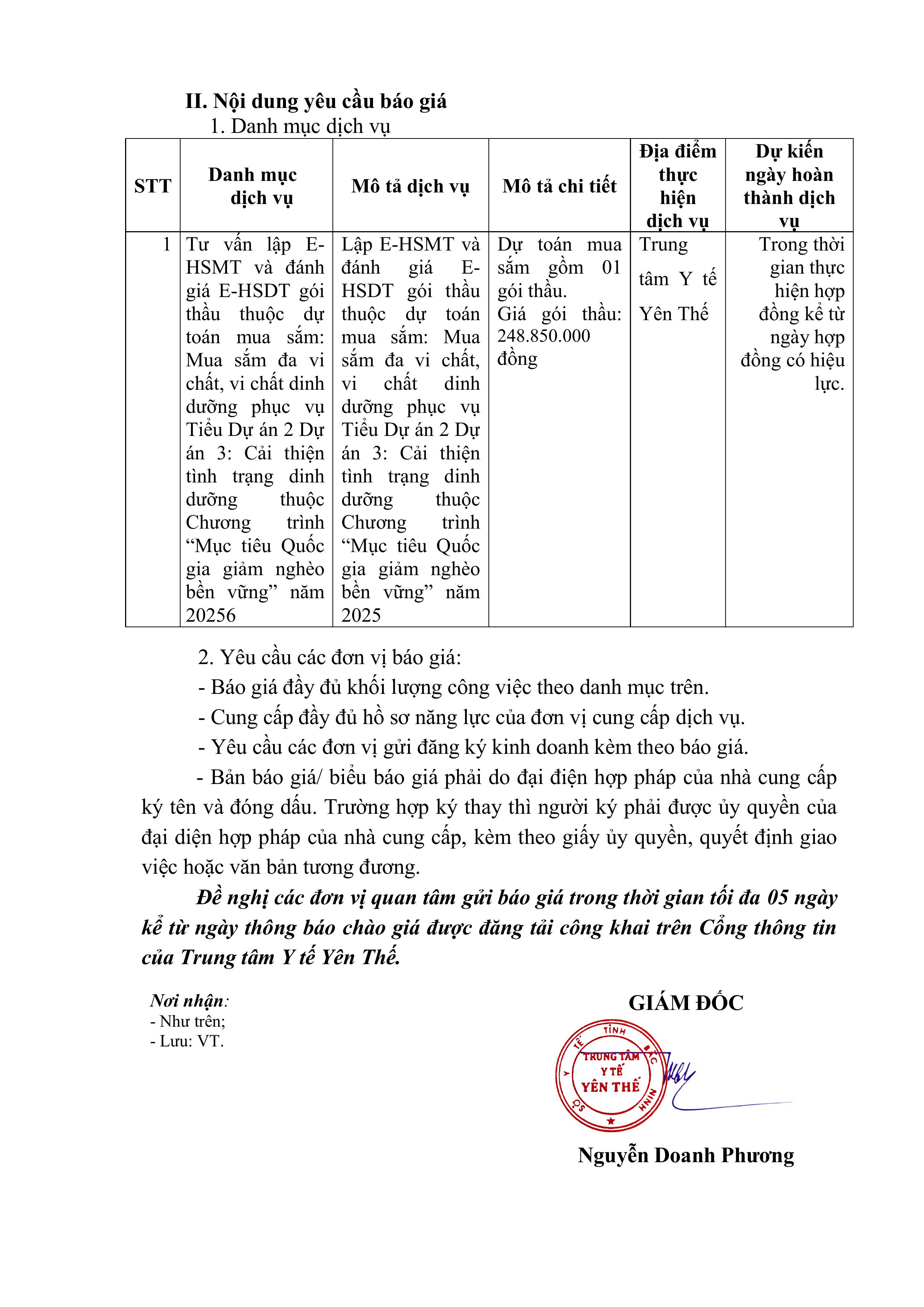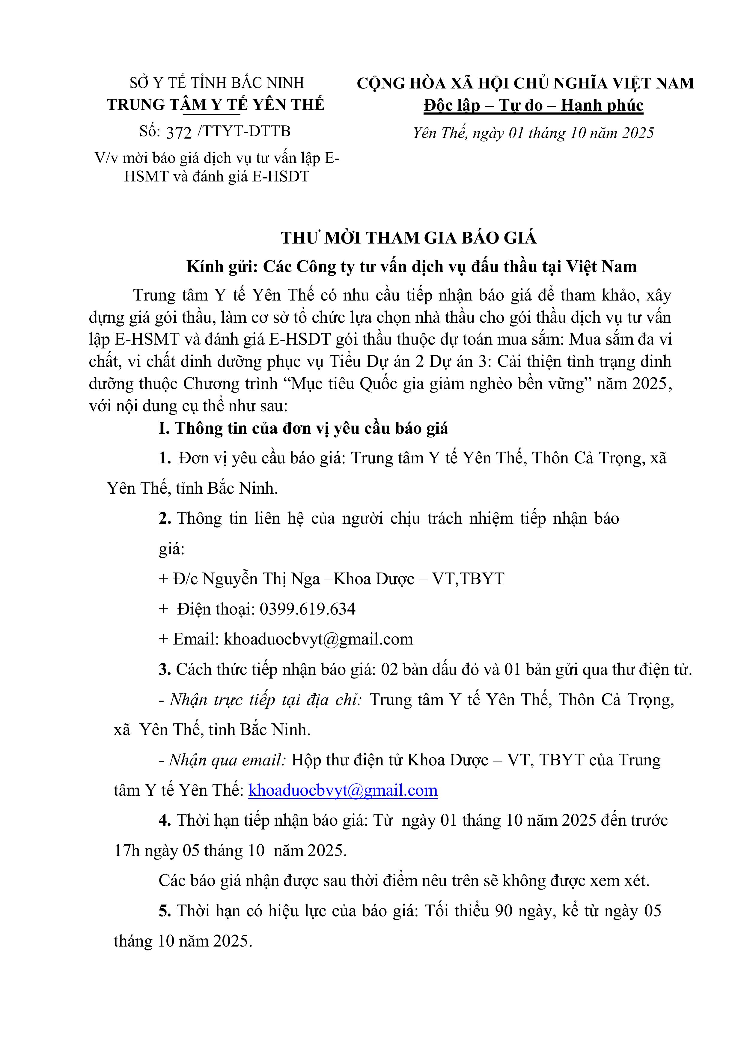 V/v mời báo giá dịch vụ tư vấn lập EHSMT và đánh giá E-HSDT