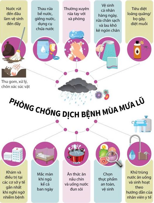Vào mùa mưa bão, tình trạng úng ngập thường xuyên xảy ra; môi trường bị ô nhiễm, các loại vi-rút, vi khuẩn phát triển mạnh. Đặc biệt nước từ các hố ga, nhà vệ sinh công cộng, khu vực chứa nước thải sinh hoạt, hóa chất, nước thải từ các Khu công nghiệp mang nhiều mầm bệnh… là nguyên nhân của một số bệnh da liễu nước ăn chân, mẩn ngứa, viêm da,… và các bệnh đường tiêu hóa như tả, lỵ, thương hàn, nhiễm khuẩn, nhiễm độc thức ăn do vi khuẩn và một số bệnh như đau mắt đỏ, viêm đường hô hấp... Để chủ động vệ sinh môi trường, phòng chống bệnh dịch sau mưa bão, Ngành Y tế khuyến cáo người dân cần thực hiện một số biện pháp sau: