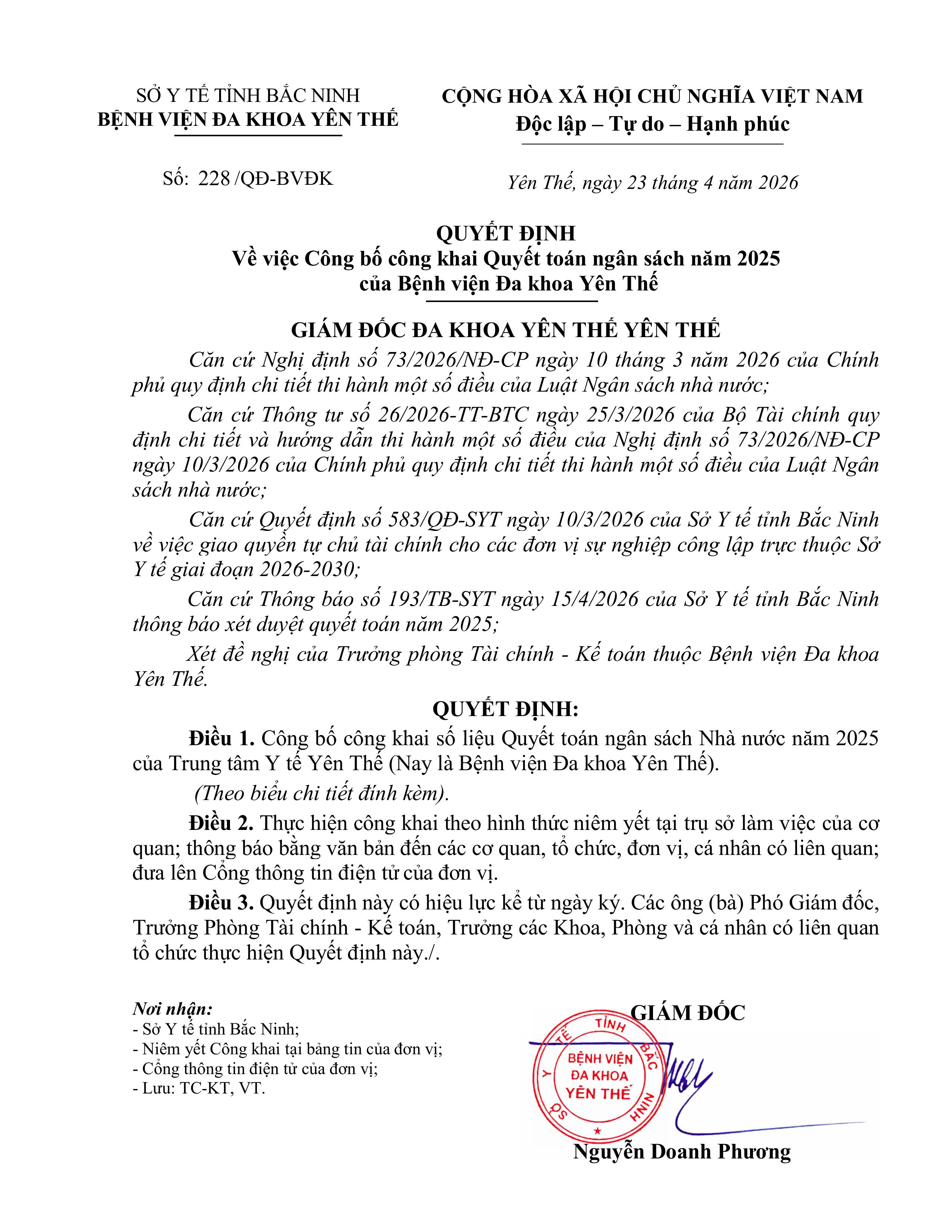 Công bố công khai Quyết toán ngân sách năm 2025 của Bệnh viện Đa khoa Yên Thế