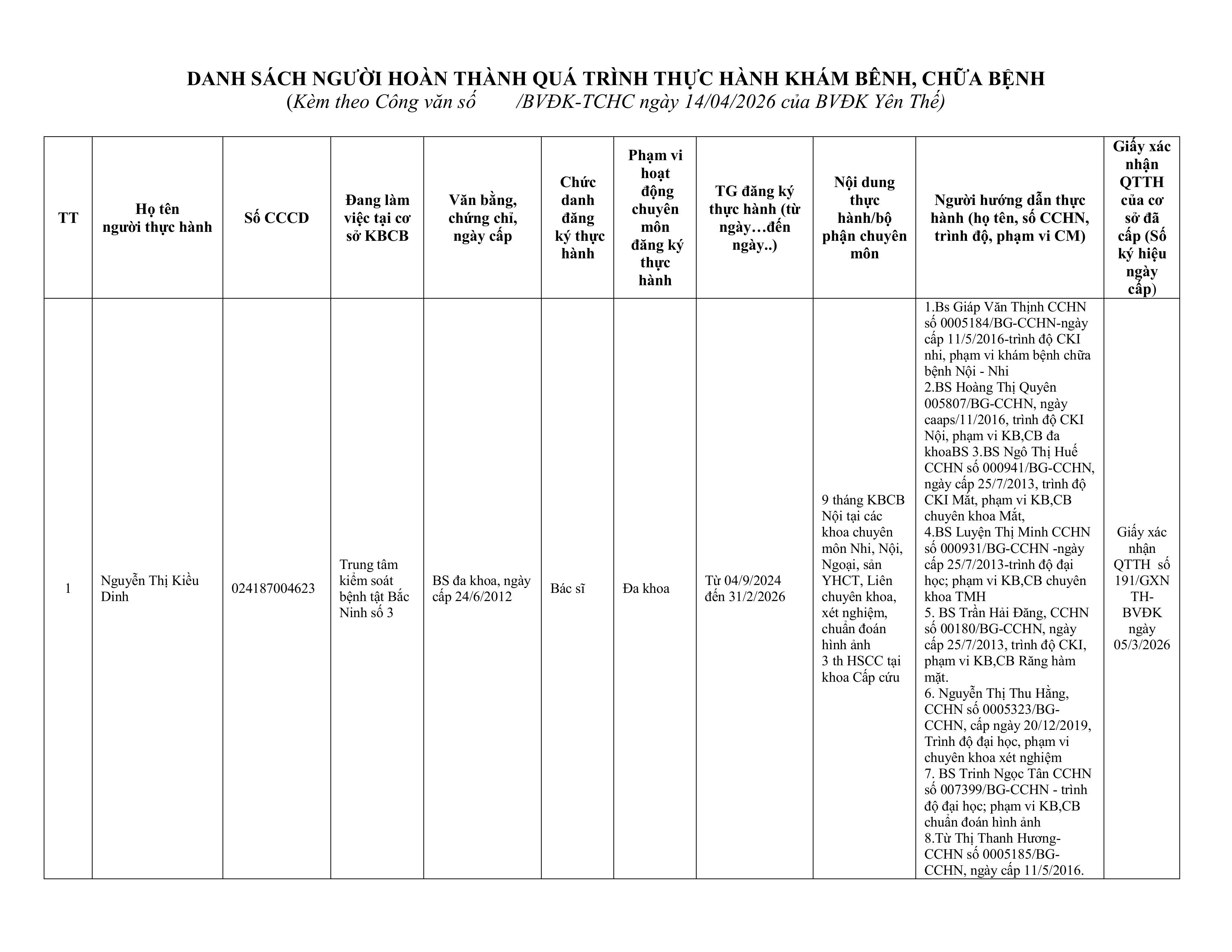 - Danh sách thực hành KCB tại BVĐK Yên Thế 17/04/2026