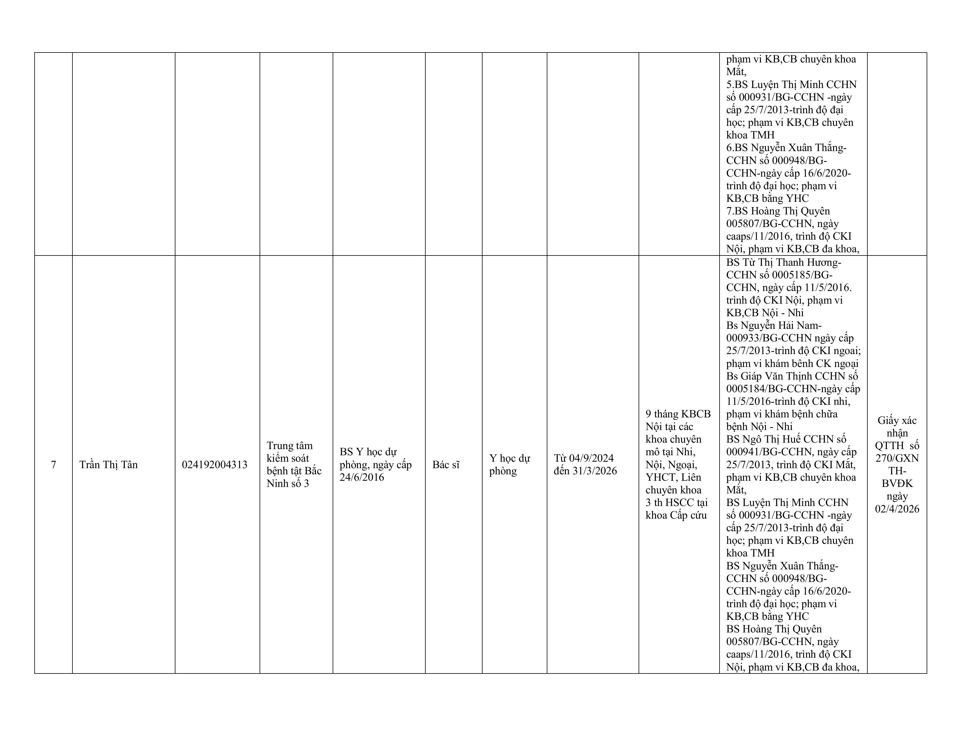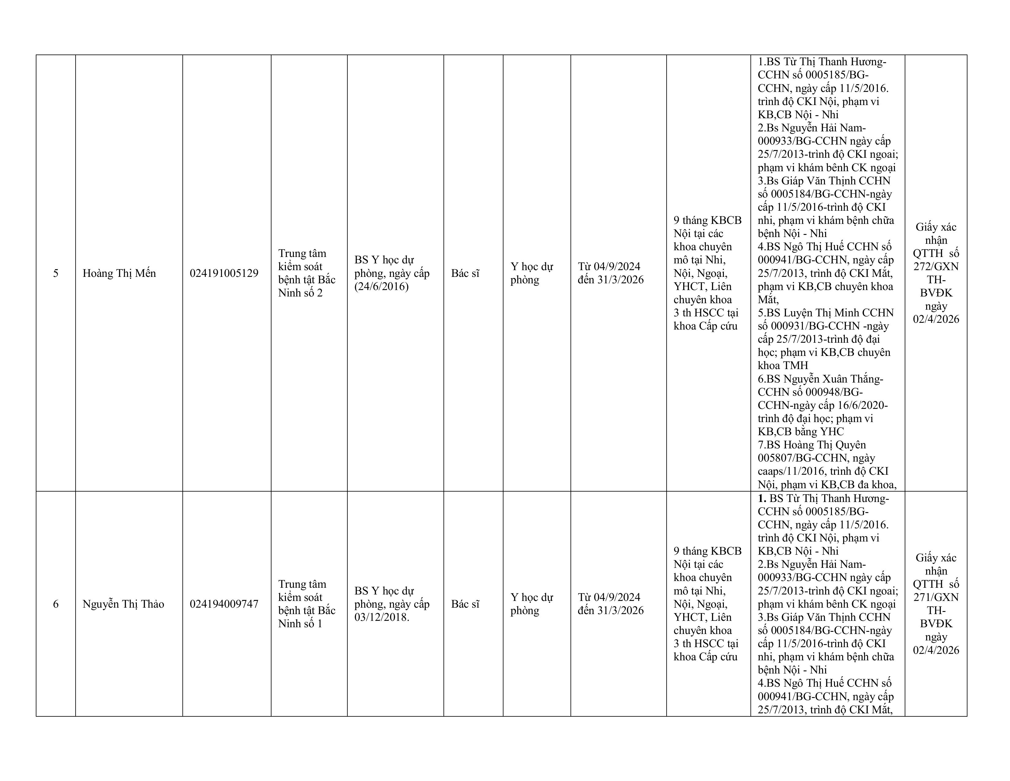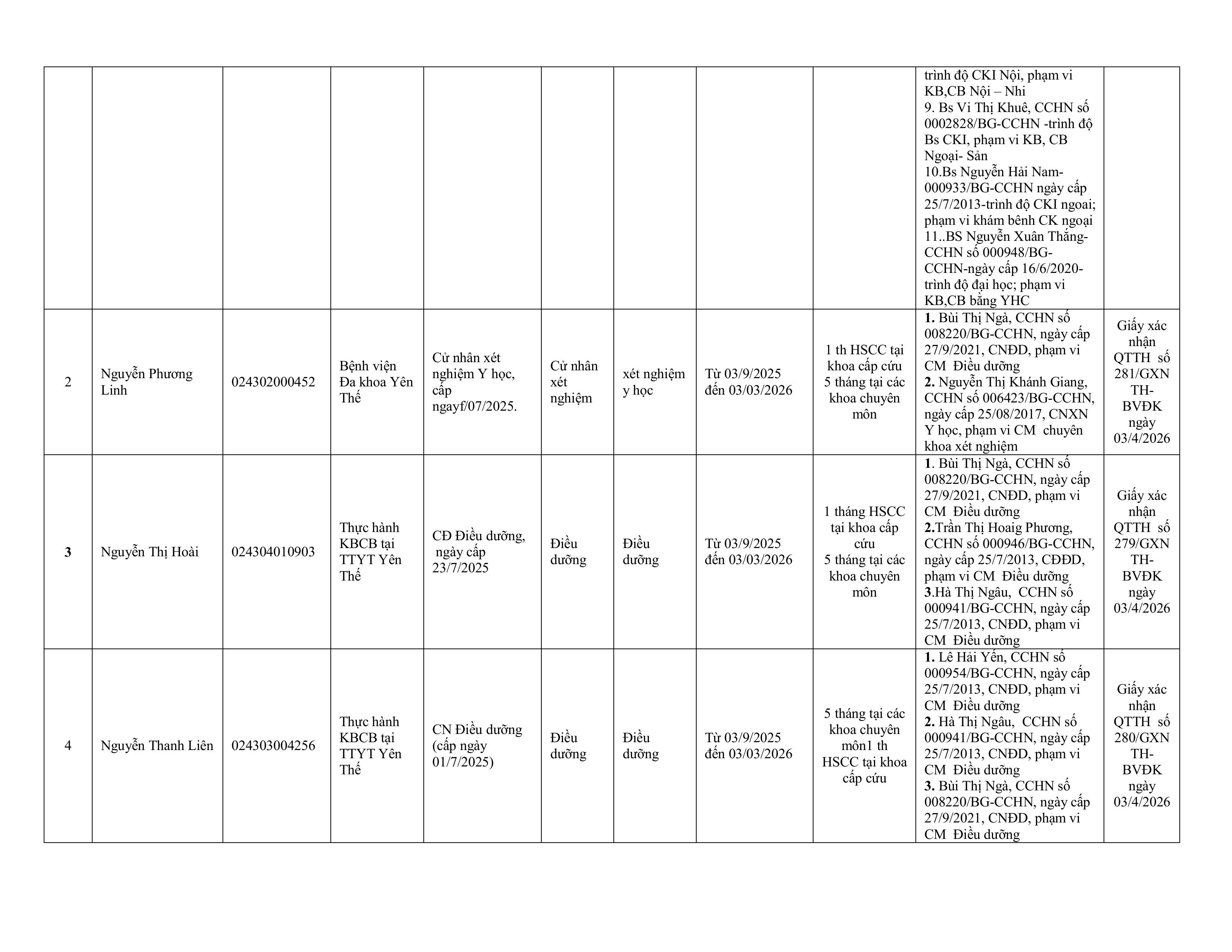 Danh sách thực hành KCB tại BVĐK Yên Thế