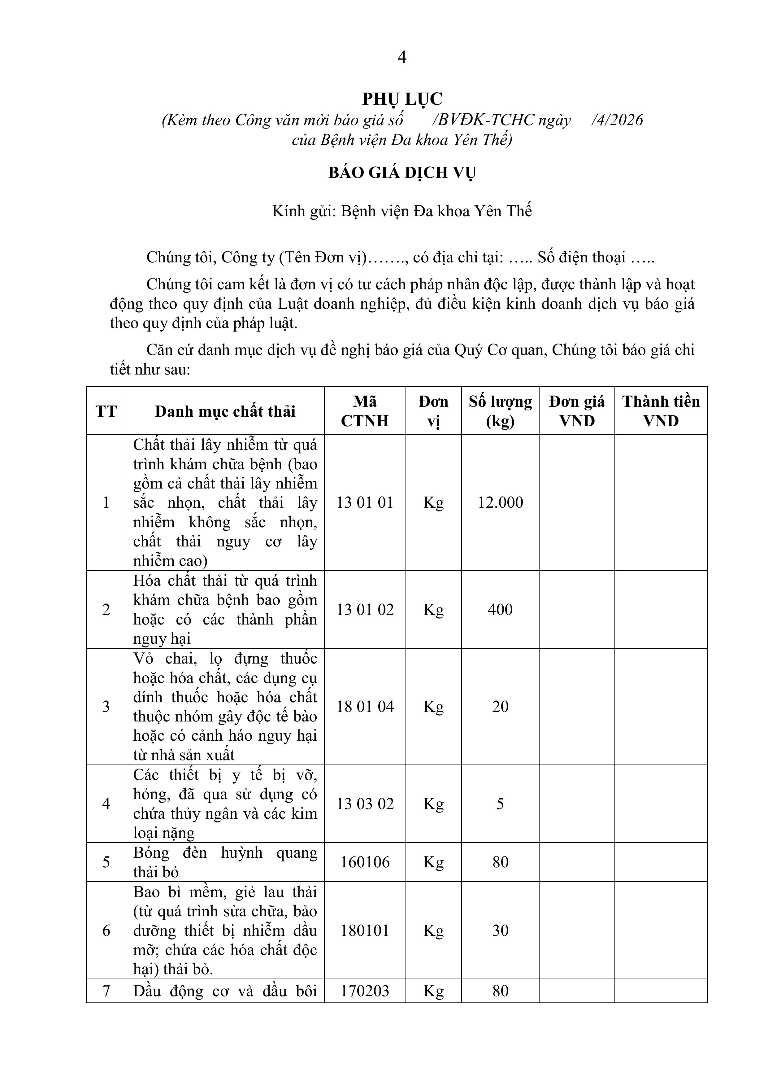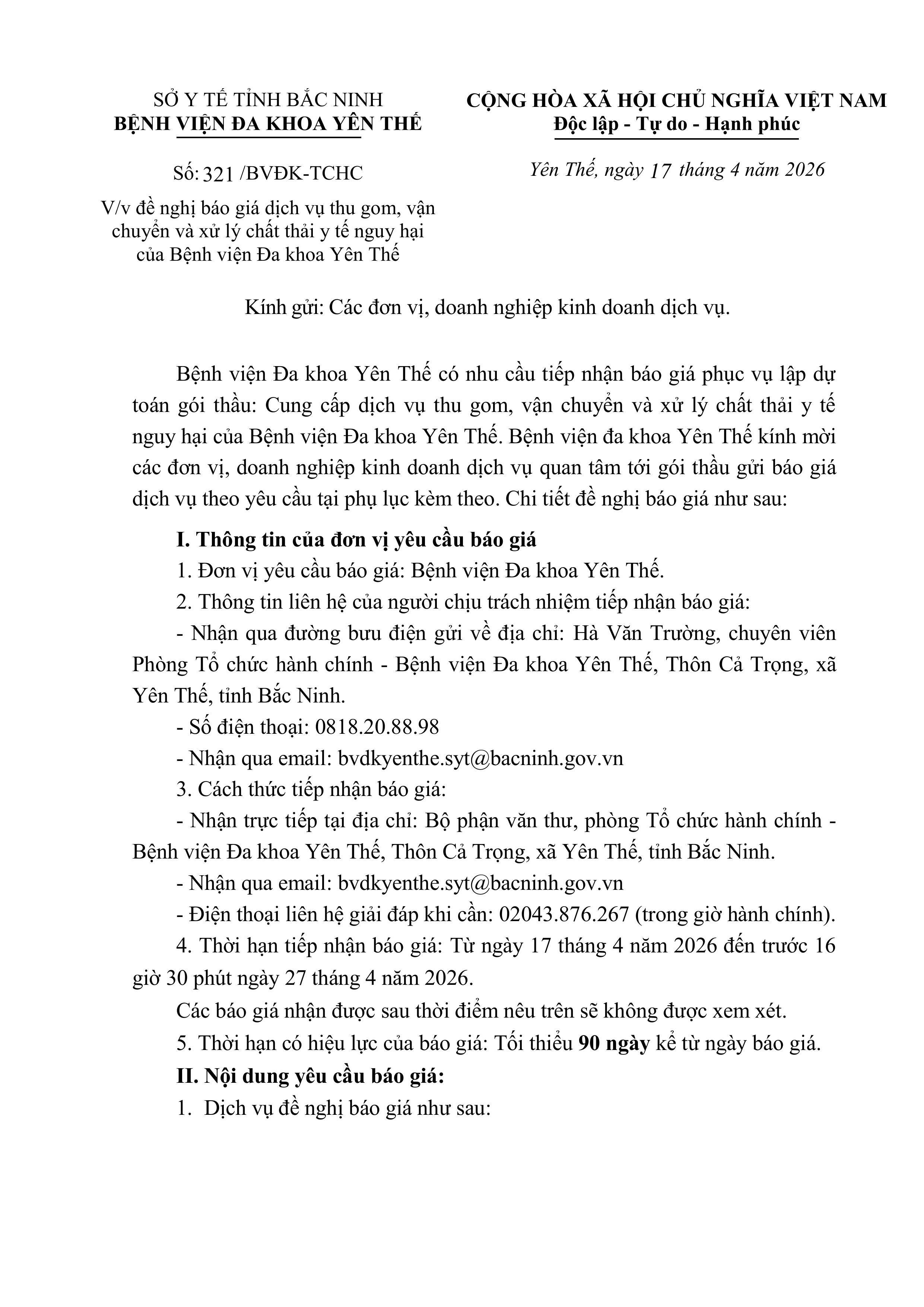 - Thư mời báo giá dịch vụ thu gom, vận chuyển và xử lý chất thải Y tê nguy hại 17/04/2026